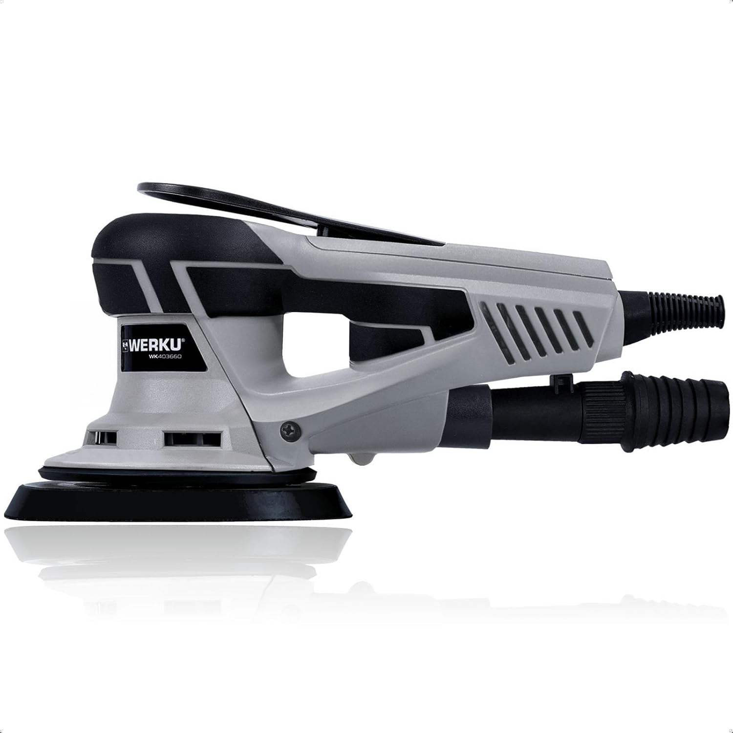 Werku WK403260 Wand-Decken-Rundschleifer Gehäuse aus ABS und Aluminium bürstenloser Motor Dauerbetrieb-Knopfschalter Staubsaugerkompatibles Absaugsystem Rutschfester, ergonomischer Griff Zusatzhandgriff Geschwindigkeitswähler Integriertes LED-Licht...