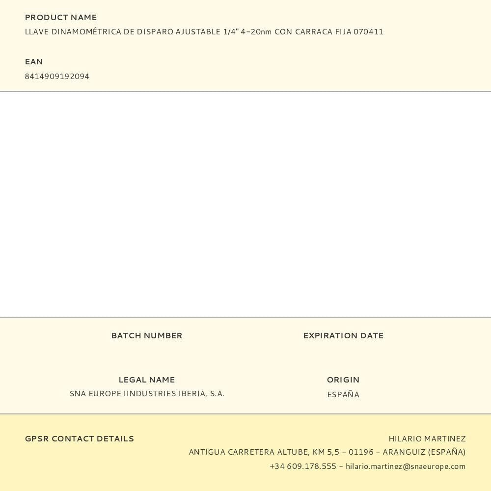 Llave dinamométrica de disparo ajustable, inglesa, ¼ pulg 4 - 20 mm con carraca fija. precisión: ± 4% en sentido horario. cabezafija de carraca. carraca reversible con 45dientes/ángulo de acción de 8°. mango de plástico para mayor comodidad. norma: iso6789:2003