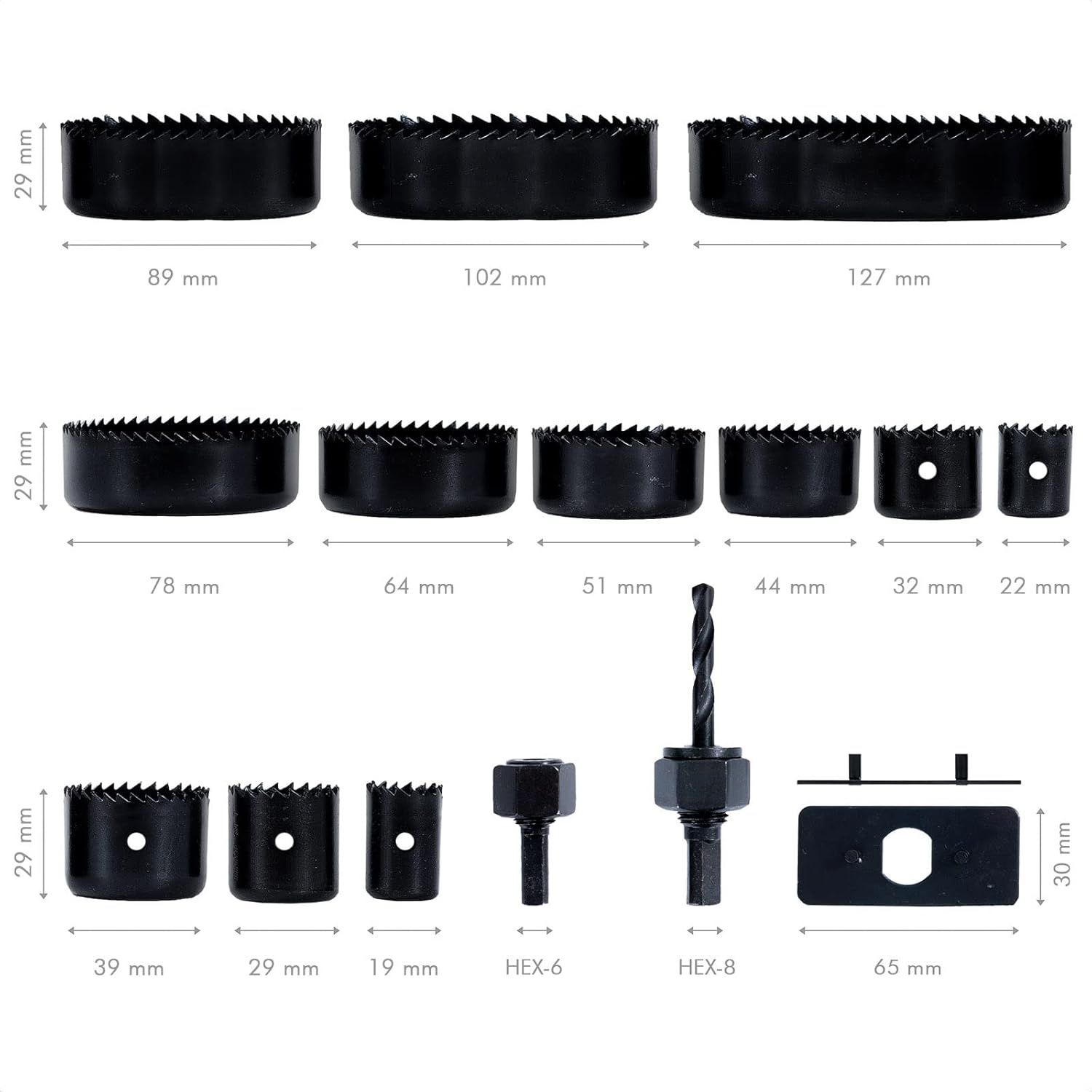 - Incluye 12 sierras de corona de diferentes diámetros